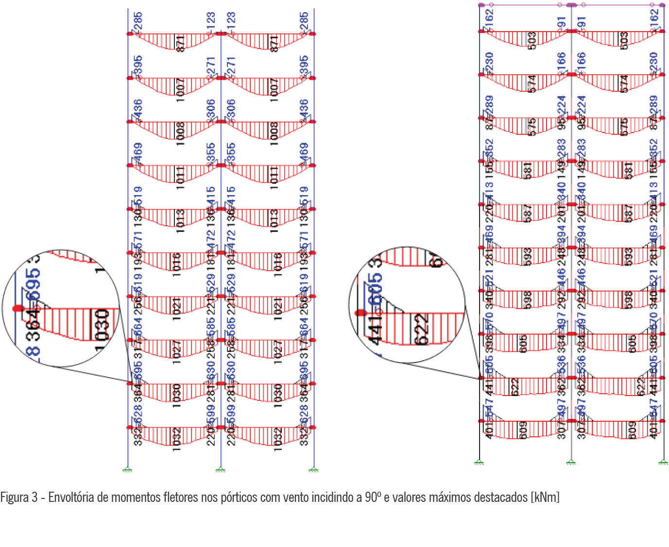 Na Figura 3 são apresentadas as envoltórias de momento fletor dos pórticos de fachada e centrais na direção 90º, com as ações horizontais majoradas por γz. Observa-se a inversão de momentos na região viga-pilar até o 8º pavimento. No caso do vento na direção 0°, a inversão de momentos fletores foi observada até o 4º pavimento.