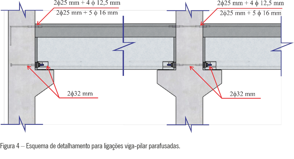 Para os momentos fletores positivos, foram obtidos valores de 59 kNm e 441 kNm para os pórticos a 0° e 90°, respectivamente, o que exige uma área de aço de 11,66 cm². Conforme o esquema apresentado na Figura 4, há uma limitação construtiva que dificulta a continuidade da armadura positiva, devido ao espaço reduzido para o aparafusamento da ligação. Dessa forma, a conversão da área necessária em bitolas comerciais resultou na adoção de 2Ø32 mm, correspondendo a uma área efetiva de 16,08 cm², o que representa um acréscimo de aproximadamente 37% em relação à área mínima requerida.