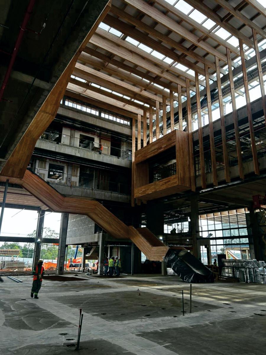 O segundo desafio, segundo Claro, estava relacionado às interfaces entre os diferentes sistemas construtivos aplicados no edifício. “Além das tratativas técnicas relacionadas às características intrínsecas e naturais de cada sistema (pré-fabricado de concreto, alvenarias, estrutura metálica, madeira engenheirada, concretagens in loco, caixilhos de alumínio e vidro etc.), os níveis de tolerância dimensional de cada um destes sistemas são distintos. Portanto, foram necessárias muitas reuniões entre as equipes técnicas responsáveis por cada disciplina, sob liderança da A|W – Athie Wohnrath, para buscarmos os alinhamentos e entendimentos necessários”, explica.