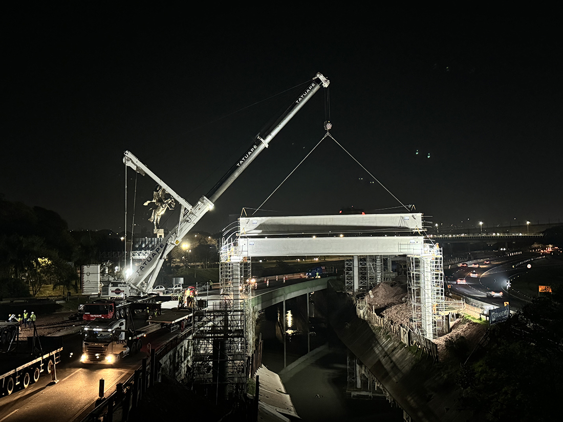 De acordo com Frizo, na etapa de superestrutura, a obra demandou a execução de trechos em balanço sucessivo, com 101,5 metros de vão central sobre a Rodovia Presidente Dutra, mantendo o tráfego seguro em uma das vias mais movimentadas do país. A complexidade dessa etapa exigiu planejamento logístico minucioso, que contemplou análises de interferências viárias e a definição de janelas operacionais de segurança.