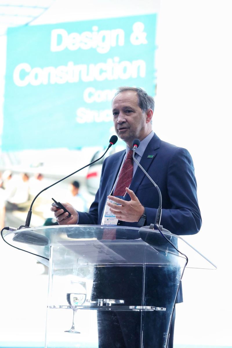 Em seu pronunciamento na solenidade de abertura, Timerman fez um balanço de sua gestão, encerrada neste ano (2025), incluindo o Capítulo Nacional do IBRACON no American Concrete Institute (ACI), a construção da nova sede da Cooperativa dos Artesãos da Barra Nova (COOPERARTBAN) e a participação do instituto na COP30, juntamente com a Associação Brasileira de Cimento Portland (ABCP) e demais entidades da construção. “O concreto produzido no país é um dos menores emissores de gases de efeito estufa — 635 kg de CO2e por tonelada de cimento no mundo, contra 560 kg de CO2e por tonelada de cimento no Brasil. Essa ação conjunta tem o objetivo de mostrar o que tem sido feito no país para promover a sustentabilidade do concreto”, explicou.